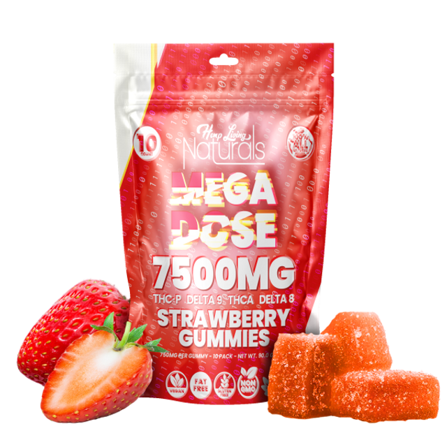Mega Dose Edibles. Each gummy contains 750mg of cannabinoids. Ten gummies total per package, 7500mg of cannabinoids total.